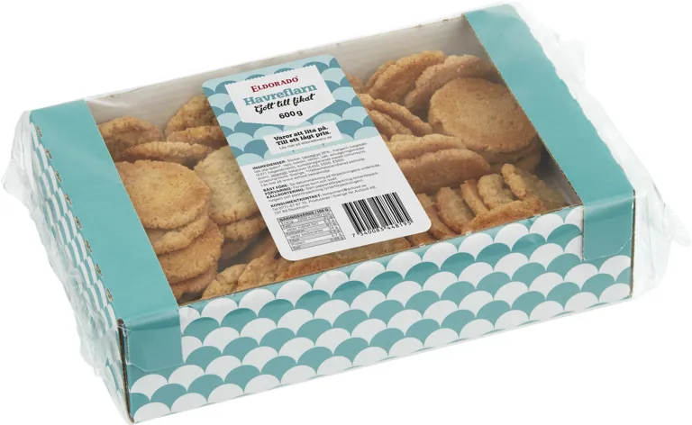 Socker, HAVREGRYN 26%, margarin (vegetabilisk olja (palm*, raps, kokos), vatten, salt, emulgeringsmedel (E471 (vegetabiliskt)), surhetsreglerande medel (citronsyra), arom), VETEMJÖL, bakpulver (E450, E500, E503). *Hållbarhetscertifierad palmolja.
