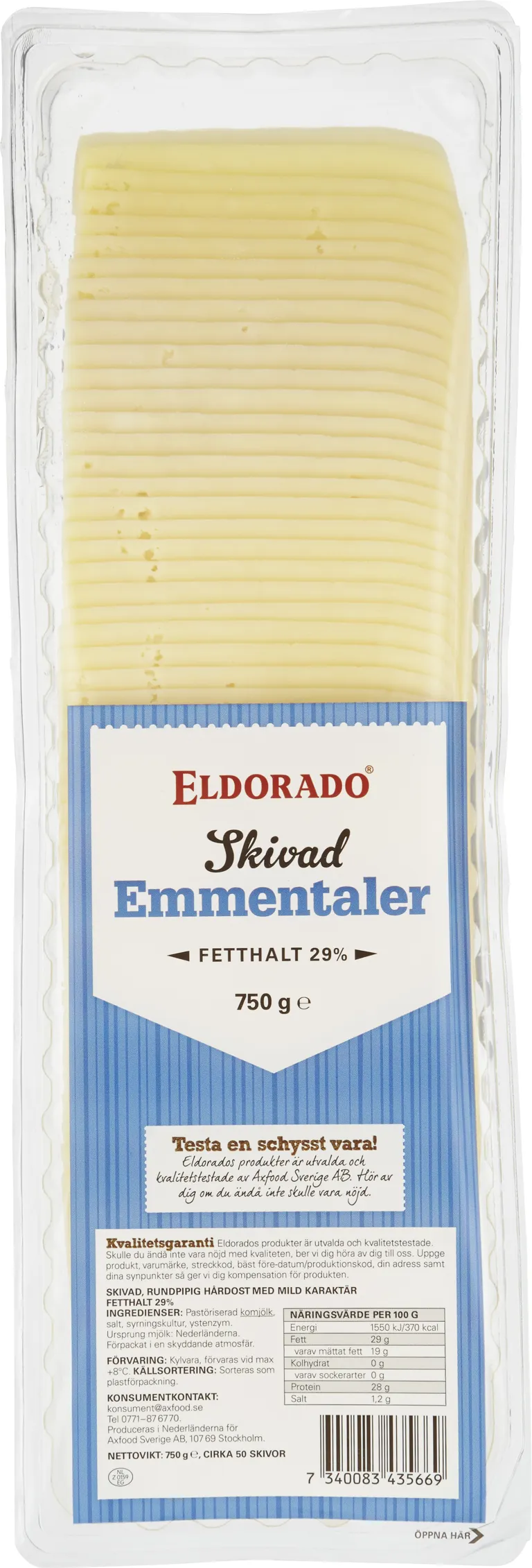 Skivad Emmentalerost. Fetthalt 29%. 750 gram.