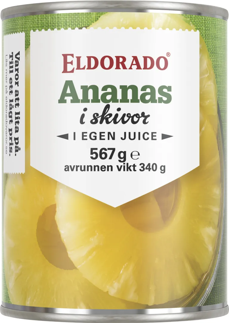 Ananas i skivor i egen juice. Avrunnen vikt 340 gram.