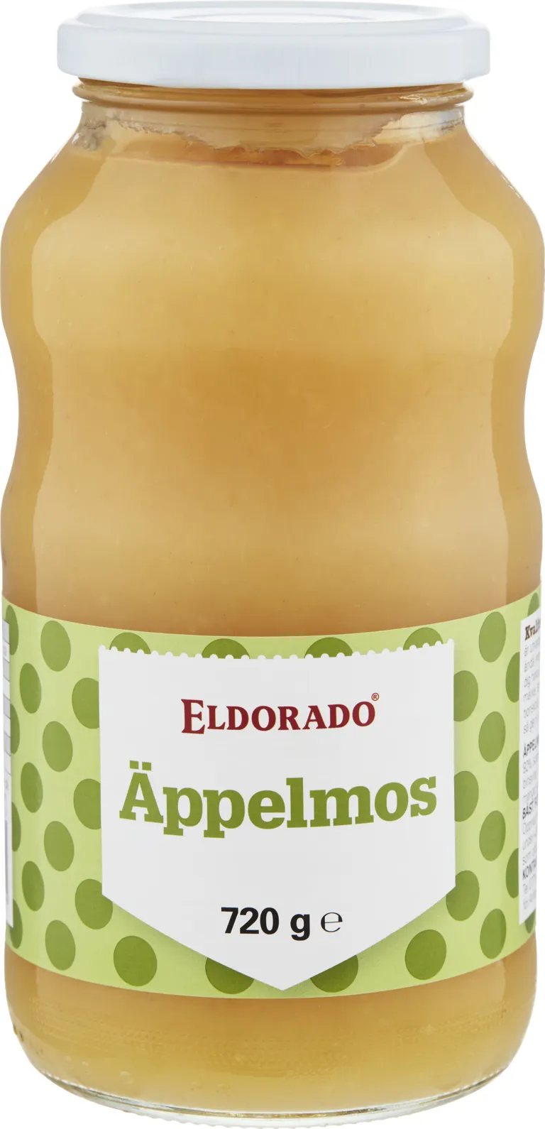 Äpplen 93%, socker 7%, surhetsreglerande medel (citronsyra), antioxidationsmedel (askorbinsyra), konserveringsmedel (E202). Total mängd socker 18 g per 100 g äppelmos.