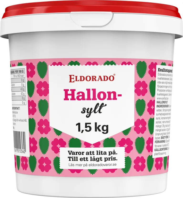 Socker, hallon, vatten, förtjockningsmedel (pektin), surhetsreglerande medel (citronsyra), konserveringsmedel (E 202, E 211). Fruktmängd: 35 g per 100 g. Total mängd socker: 42 g per 100 g.
