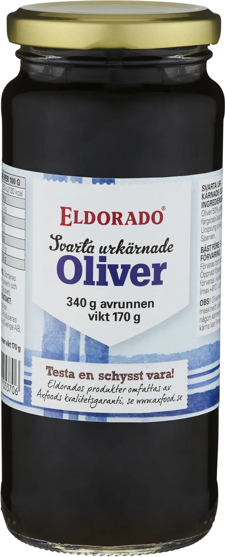 Svarta urkärnade oliver. 340 gram, avrunnen vikt 170 gram.