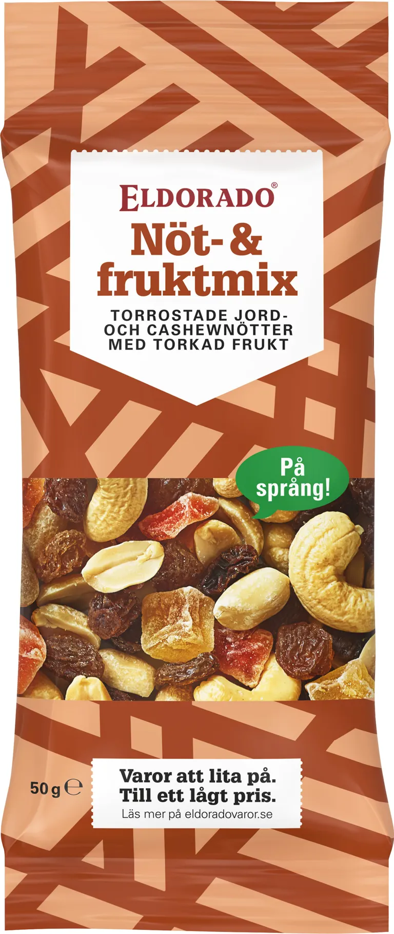 Nöt-& fruktmix med torrostade jordnötter, cashewnötter och torkad frukt. 50 gram.