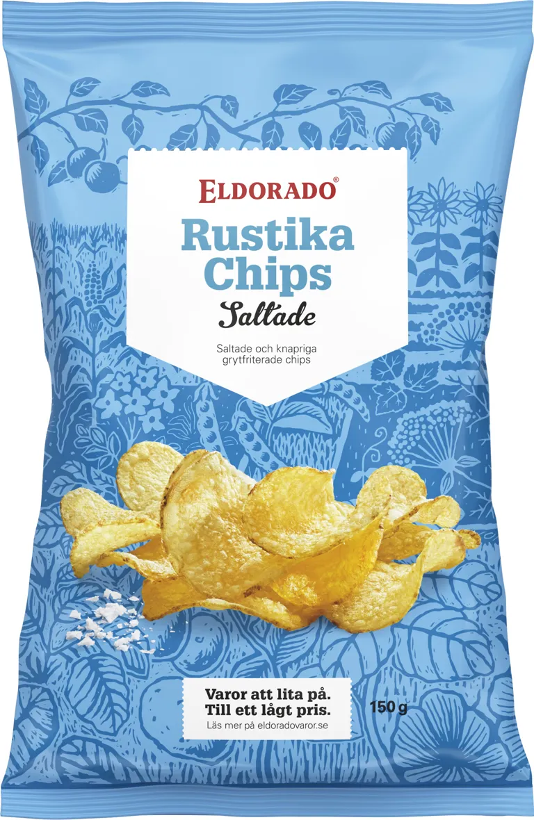 Rustika chips med smak av salt. Grytfriterade och knapriga. 150 gram.