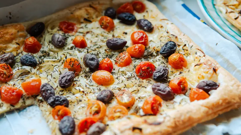 Frasig bladdegspizza med tomater och oliver. Perfekt att bjuda på till någon du tycker om! Bladdegspizzan kostar ca 28 kr per portion när du använder produkter från Eldorado.