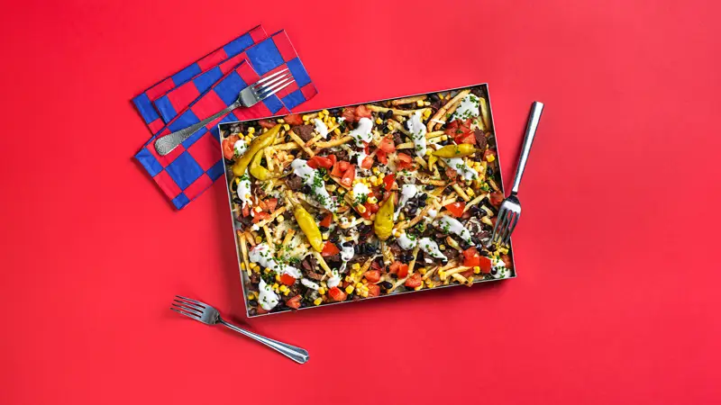 Festliga dirty fries med kebab och grönsaker som går snabbt att laga. Ställ fram mitt på bordet och låt alla hugga in! En rätt med extra allt för endast 31 kr per portion.