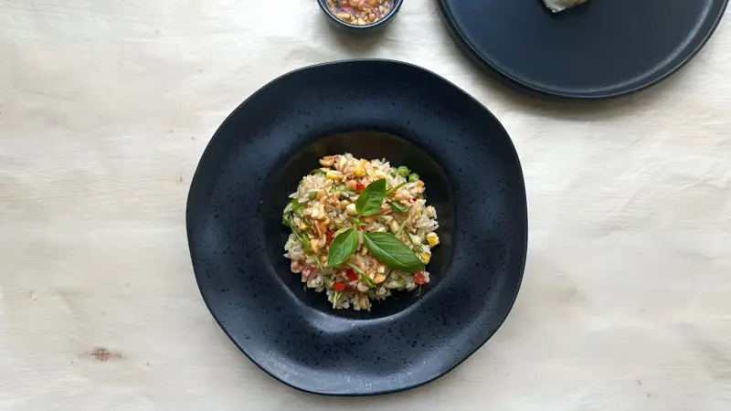 Har du kokt ris över? Perfekt att laga fried rice på! I detta receptet steker vi jasminris med ägg, grönsaker och toppar med syrlig jordnötsdressing. En enkel rätt som lagas på några minuter för ca 17 per portion.