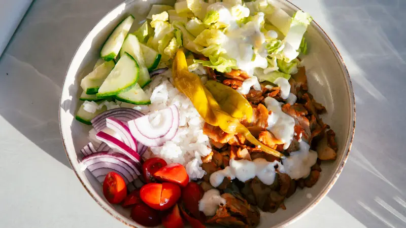 I det här receptet använder vi kycklingkebab, krispiga grönsaker, kebabsås och kokt ris för extra mättnad.