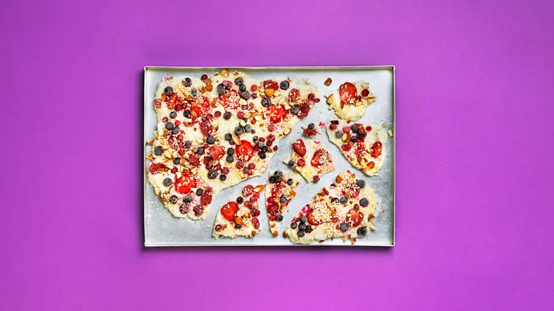 Ett barnsligt enkelt recept som går att variera i oändlighet med olika toppings och smaksättningar. Receptet räcker till ett kvargbräck som går att dela i ett gäng bitar. Räkna med 15 minuter för tillagning och några timmar i frysen för att stelna.