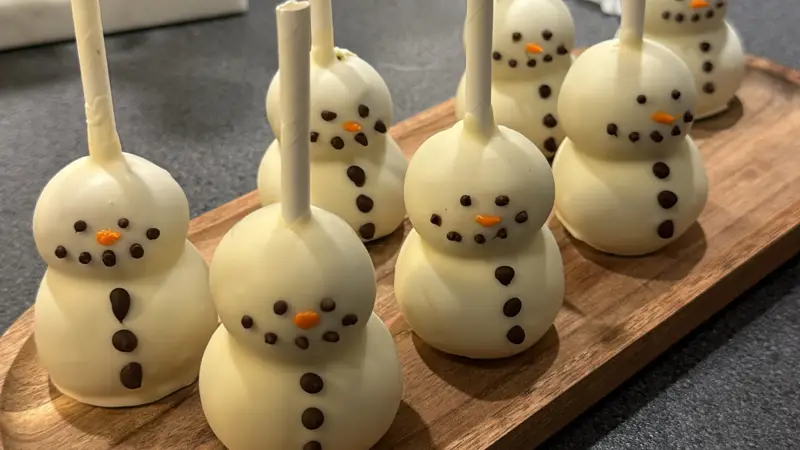 Bjud på goda cakepops gjorda av mixade pepparkakor och färskost. Cakepopsen formas till snögubbar och doppas i vit choklad. Enkla att fixa till jul- och glöggminglet! Receptet på snögubbe-cakepops har tagits fram tillsammans med Hanna Freed.
