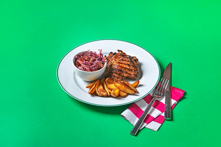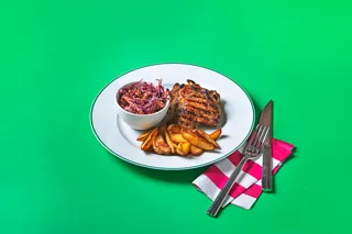Grillad kycklinglårfilé med coleslaw med äpple, curry och chili för ca 22 kr