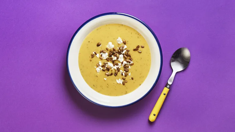Rostad butternutsoppa med frötopping och salladsost för ca 15 kr