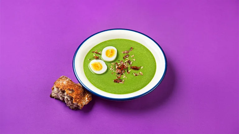 Spenat- och ärtsoppa med bacon och ägg för ca 17,5 kr