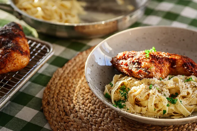 Pasta Alfredo med rostade kycklingklubbor för ca 40 kr